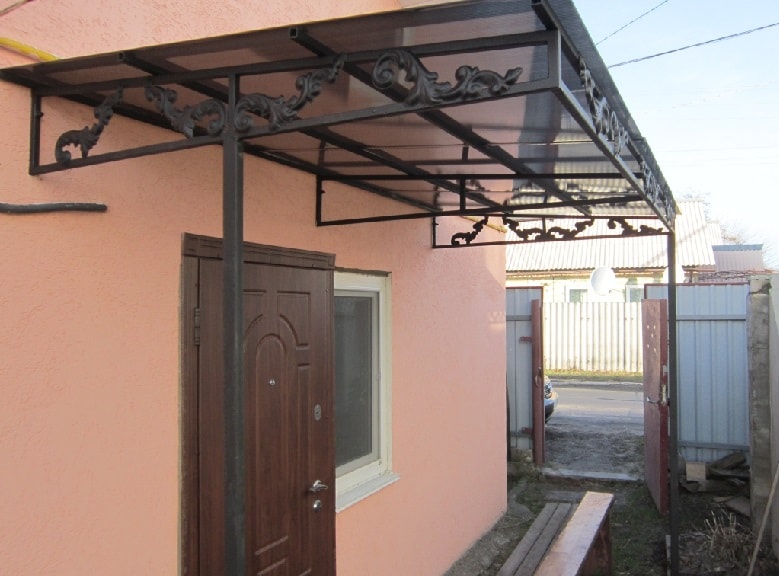 Из всех описанных выше типов козырьков для обустройства входа в частный дом, сарай или подъезд больше всего подходит односкатный прямой козырёк из металлического профиля.