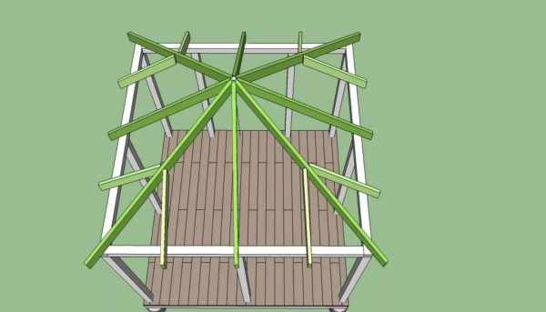 - Затем происходит установка диагональных стропил, их подрубают таким образом, чтобы они соединялись с вертикальными стойками и коньковым прогоном.