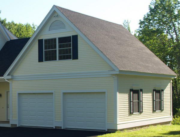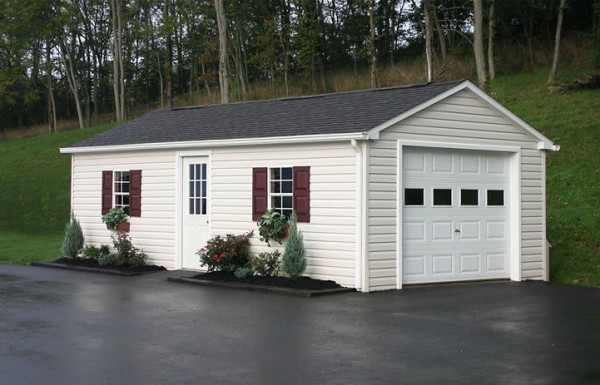 Обратите внимание! Гараж с двухскатной крышей, в отличии от односкатных, выглядит как самостоятельное сооружение. Он может располагаться не только поблизости от дома, а в любом удобном месте участка. Опытные мастера рекомендуют сделать скаты с уклоном 20-30 градусов и использовать для покрытия кровельный материал, который использовался для дома, чтобы выдержать единый стиль в оформлении.