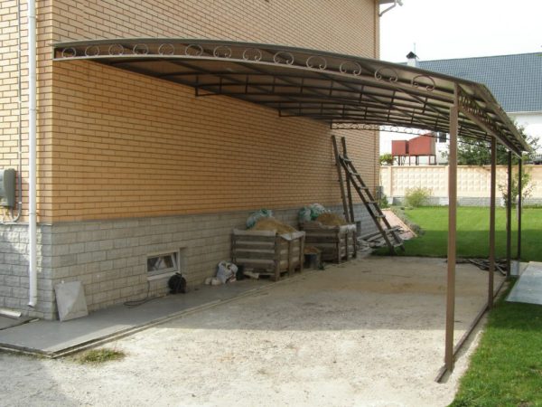 Важно! Все швы на каркасе навеса, оставшиеся после сварки, зачищают своими руками, затем грунтуют. Металлические детали покрывают устойчивой краской для дополнительной защиты от коррозии. Края карбоната подклеивают армированным скотчем.