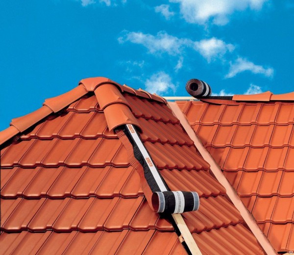 - Возьмите вентиляционную ленту, снимите с клеевой стороны защитную пленку и наклейте вдоль конька на оба ската. Она необходима для того, чтобы воздух свободно выходил из-под крыши, проветривая стропильную систему, не допуская ее загнивания. Для организации мощной принудительной вентиляции используют специальные коньковые аэраторы из пластика.