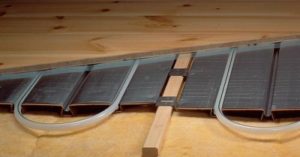 Так как в старых домах укладка напольного обогрева под стяжку была проблематична при наличии деревянных старых полов, то выход был найден только после того, как производители придумали специальные теплораспределительные пластины для водяного теплого пола.