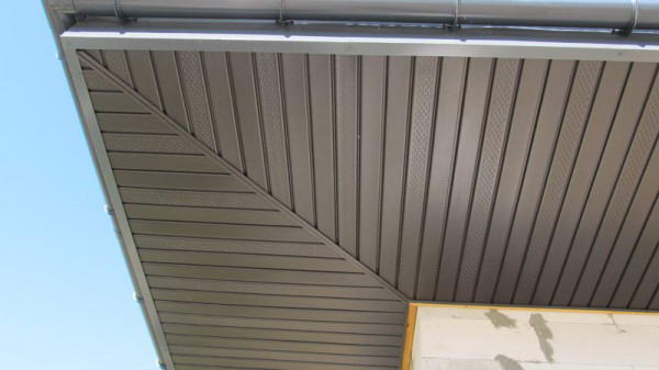 Обратите внимание! Софиты из металла использовать для подшивки удобнее, чем сайдинг, вагонку или другие материалы. Они имеют ширину до 35 см, поэтому процесс облицовки идет в 3 раза быстрее. Длина изделий достигает 6 м, а подрезать панели до нужного размера можно болгаркой с диском, предназначенным для металла или ножовкой.