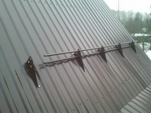>Важно! Если крыша подвергается большой снеговой нагрузке, решетка снегозадержателей при воздействии обледенелых пластов большого размера гнется и ломается. Для таких тяжелых условий производители рекомендуют использовать гибридную конструкцию, состоящую из продольных труб, вставленных в кронштейны, и приваренной к ним решетки.