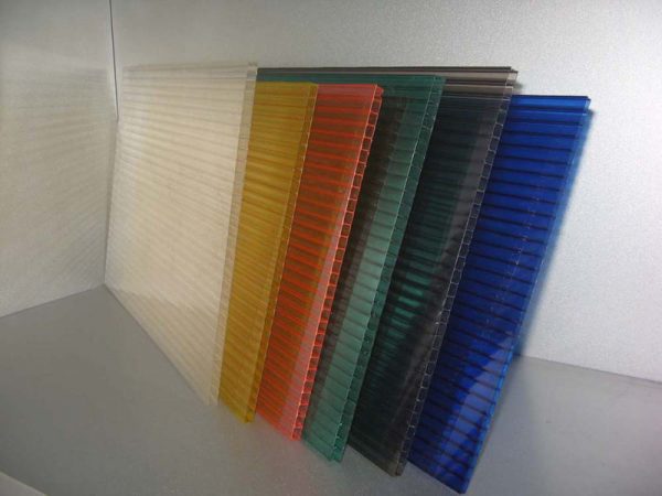 Обратите внимание! Высокий декоративный потенциал этого материала заключается в том, что с помощью добавления в полимер красящего пигмента в процессе производства, ему можно придать практически любой оттенок. Наиболее популярными цветами является зеленый, синий, красный, оранжевый, белый. Для сооружения теплиц и оранжерей используется бесцветный поликарбонат с максимальной светопропускающей способностью.