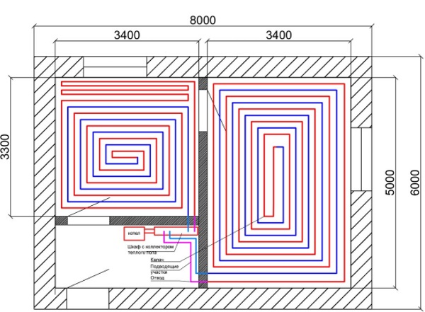 При большой площади комнаты, чтобы тепло равномерно по ней распределялось, целесообразно использовать форму улитки, так при этом способе трубы максимально покрывают пол.