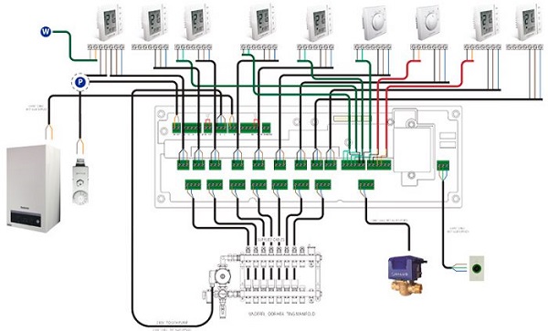 Термостат устанавливается, как правило, один на помещение, может быть одно- или многозональным. Сервоприводы (сервомоторы) устанавливаются на подаче каждого контура.