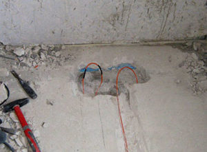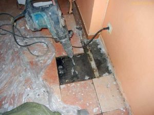 Далее расчищается доступ к поврежденному месту: поднимается часть напольного покрытия и удаляется часть стяжки.